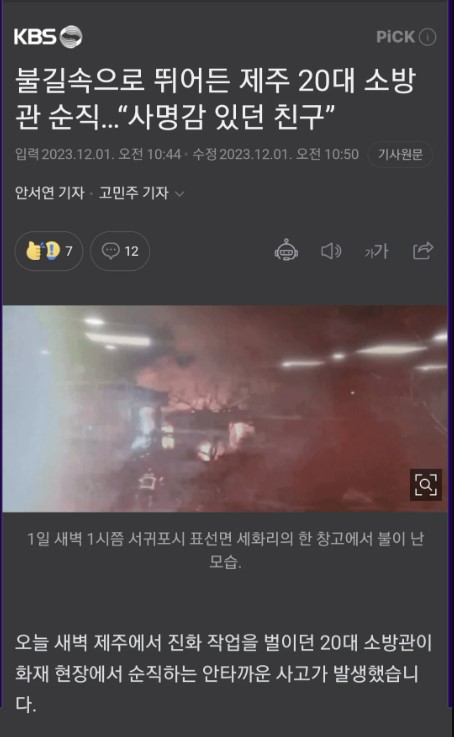 [속보] 제주 20대 소방관 80대 노인 구출 후 현장에서 사망..